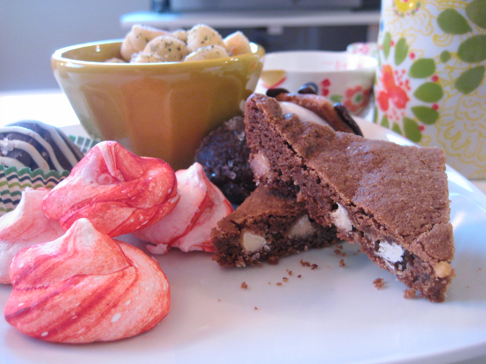 My magic Martha Stewart cookie book was the source for these light-as-air peppermint meringues. Instead of making the meringue sandwiches with ganache in between, I just made the meringues themselves. I try to make a variety every year -- some sweet, some savory, some chocolatey, some fruity, some refreshing and light. This year's line-up: